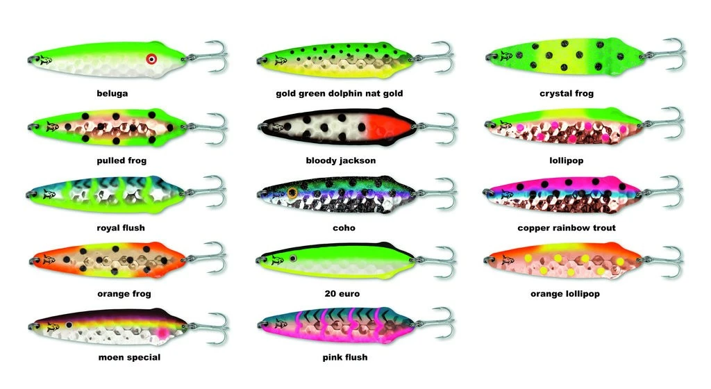 Super-agiler Flutter-Spoon für das Dorsch-, Meerforellen- und Lachsschleppen. Die wabenartiger Struktur sorgt für verführerische Lichtreflexe, in Kombination mit den vom Rhino-Trollingteam zusammengestellten Farbmustern, macht das den Freddi Flutter unwiderstehlich. Und als totale Neuerung für den Markt: dieses Modell gibt es auch als supergroßen Lachsblinker mit 190mm Länge, immer ein echtes Pfund, wenn die silbernen Torpedos auf große Heringe als Beutefische stehen. Diesen super Trolling-Spoon gibt es in den Größen 110mm (L – 12g), 145mm (XL – 20g) und 190mm (XXL – 30g). Die Hakengrößen sind abhängig von der Größe des Blinkers. Das Modell L hat die Hakengröße 1/0 und die Modelle XL und XXL die Größe 4/0. Der Blinker ist in 14 verschiedenen Farben erhältlich und somit ist für jede Bedingung ein entsprechender Spoon vorhanden.