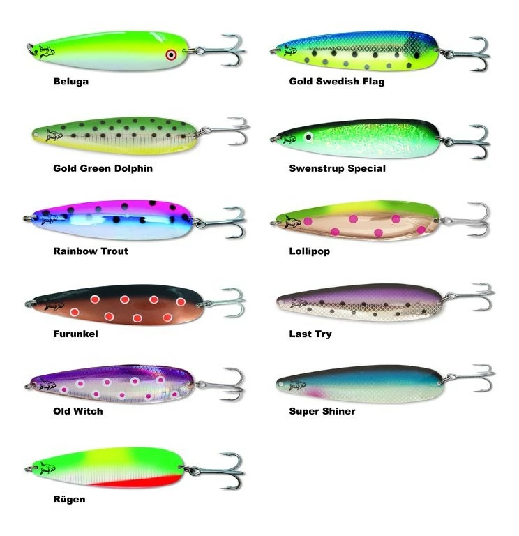 - Gold Swedish Flag – Ähnliches Konzept wie bei dem Copper Master Herring. Gold statt Silber ist nicht nur edler, sondern bringt bei klarem Wasser und Sonne deutlich mehr Fische ins Boot. Die schwarzen Punkte sorgen für den nötigen Kontrast und stacheln die Fische zusätzlich an.